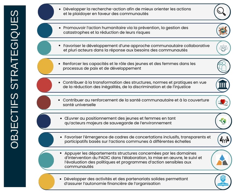 Créée en avril 2021, le Partenariat pour le Développement des Initiatives Communautaires (PADIC) est une organisation non gouvernementale qui a vocation à mettre les jeunes et les femmes aux cœur des processus de paix et de développement durable des communautés dans sa vision globale d'œuvrer à l’ancrage de sociétés résilientes, stables, inclusives et participatives.